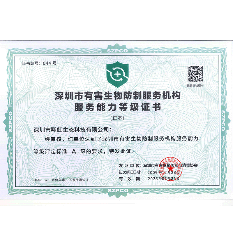 深圳市翔虹生態科技有限公司成立于1995年,是深圳最早成立的專業蟲害防治公司之一。公司發展至今獲得全國有害生物防制服務A級資質、廣東省有害生物防制服務A級資質、深圳市有害生物防制服務A級資質、廣東省有害生物防制服務A級資質、深圳市有害生物防制服務甲級資質的單位,是中國有害生物防治協會會員、廣東省有害生物防治協會會員、深圳市有害生物防治協會理事單位,多次獲得“深圳市十佳消殺單位”榮譽。
